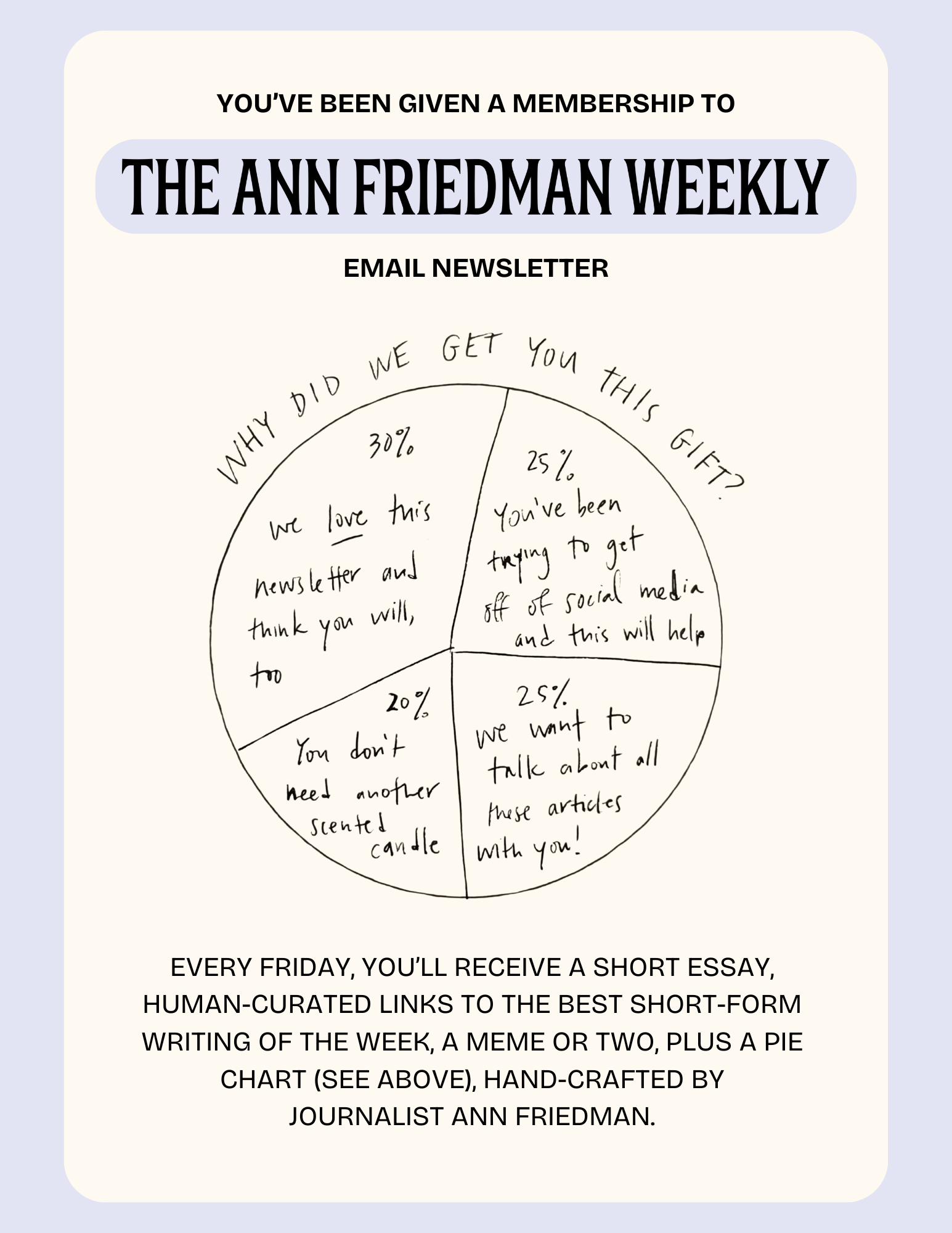 After purchase, you’ll receive a designed PDF gift card— including a little explanation of the newsletter and a custom pie chart!—to share with the recipient.
