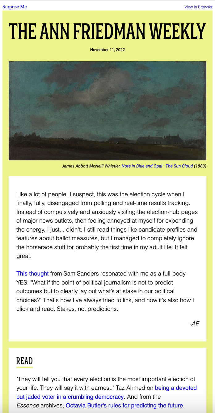 The Ann Friedman Weekly is a dispatch full of great writing and rare gems from all over the internet. It arrives every single Friday, rain or shine. I’ve been sending it since 2013, and these days it hits 55,000 inboxes. Paying members get bonus features like the hand-drawn pie chart.